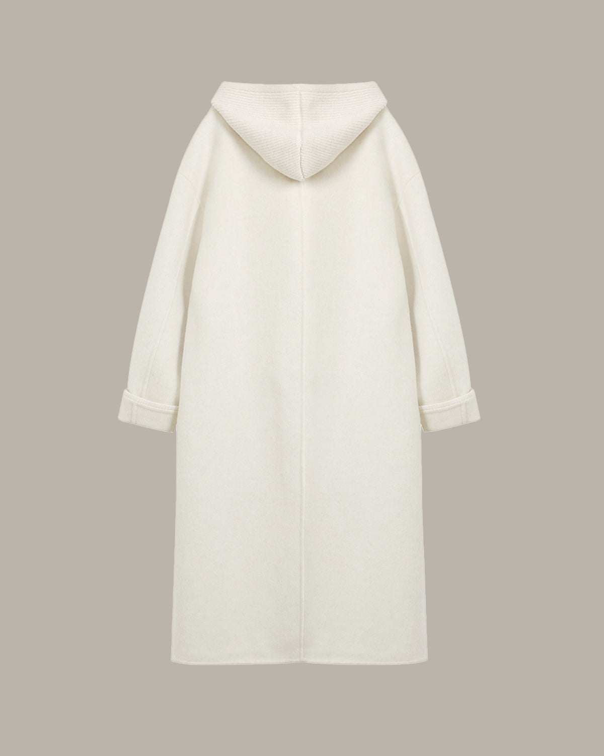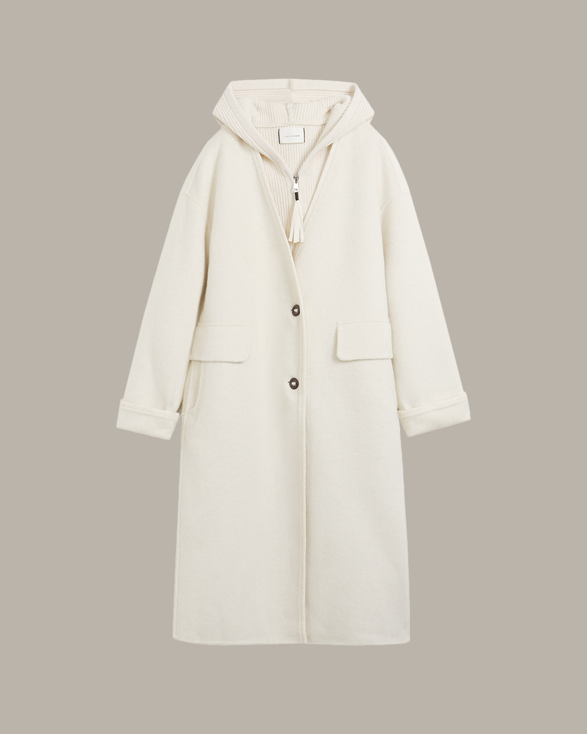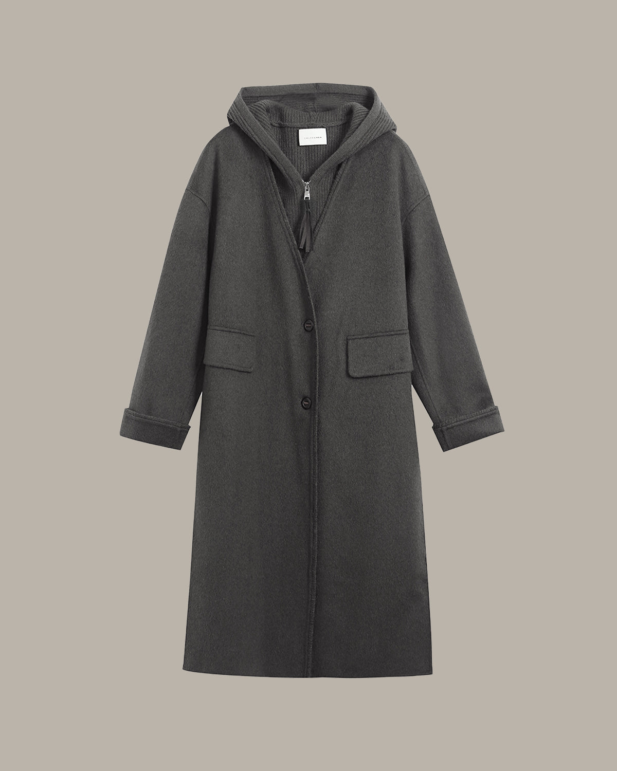 This earthy 2-piece set (hooded wool coat + knit vest) shines with a lined hood and contrast buttons. The relaxed mid-length coat pairs comfort and minimalism: match with the vest + trousers for polish, or layer over loungewear for ease. A versatile staple merging timeless warmth and modern grace.