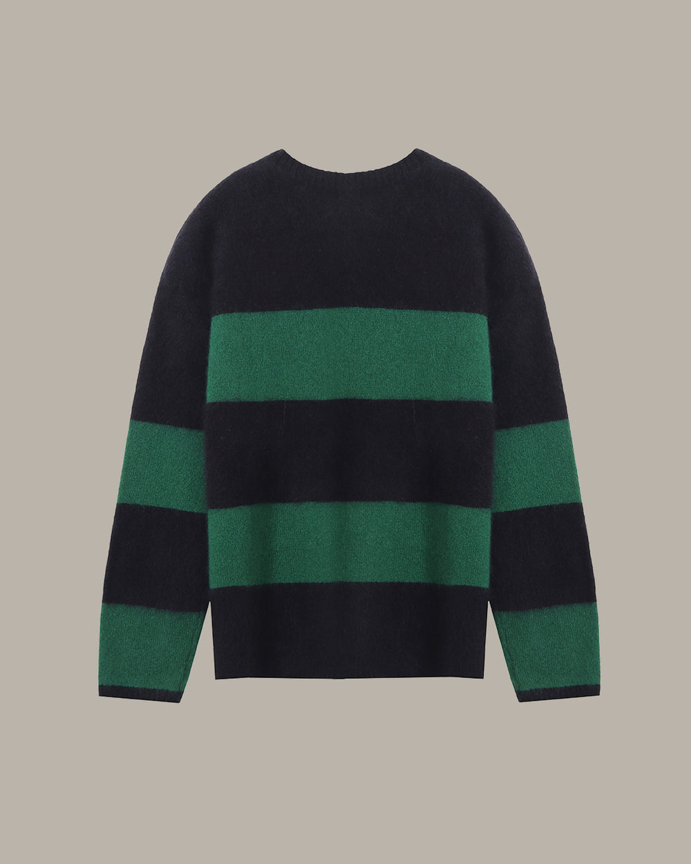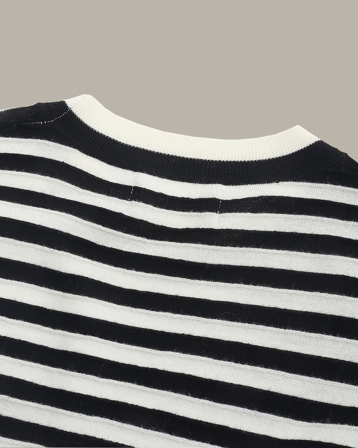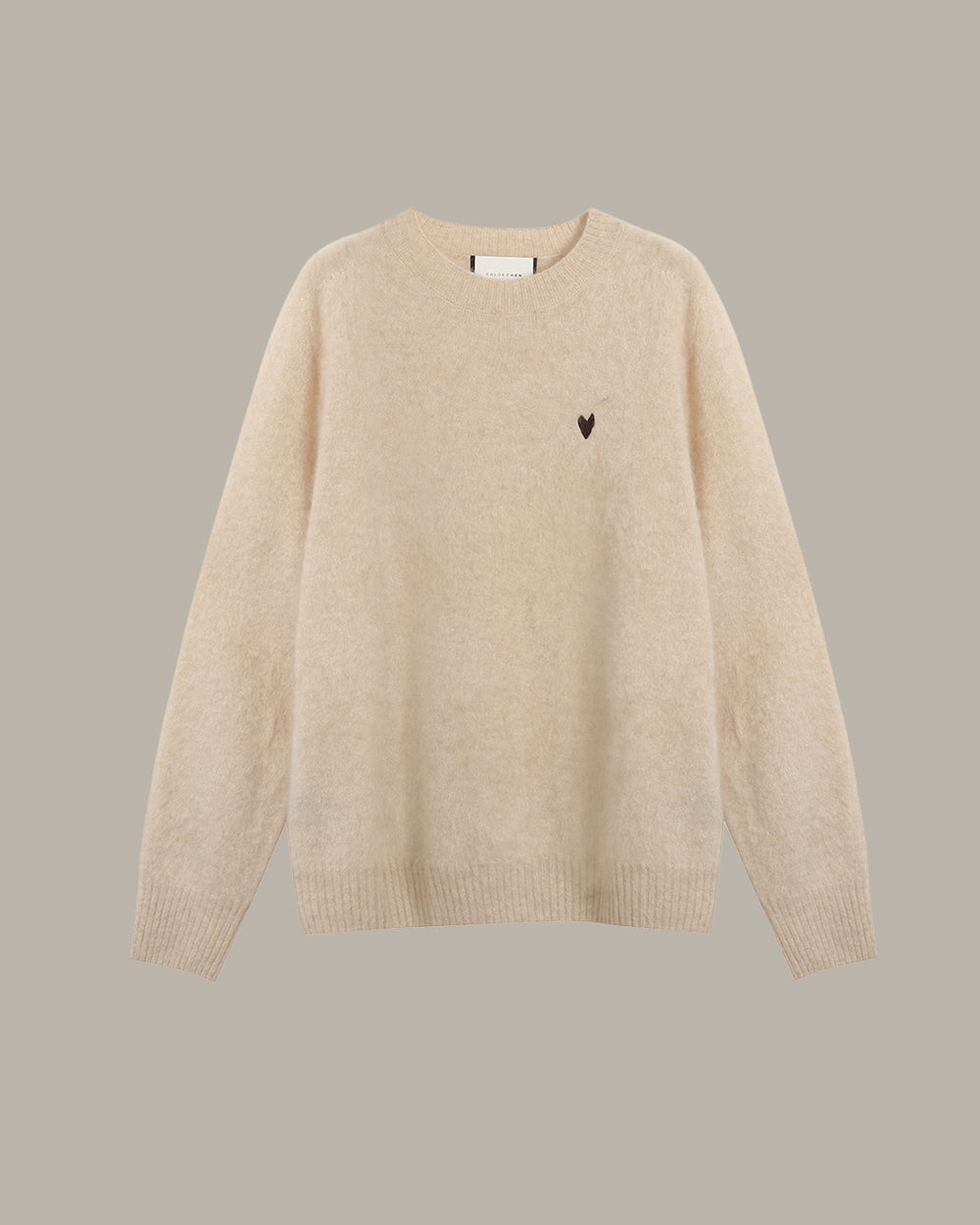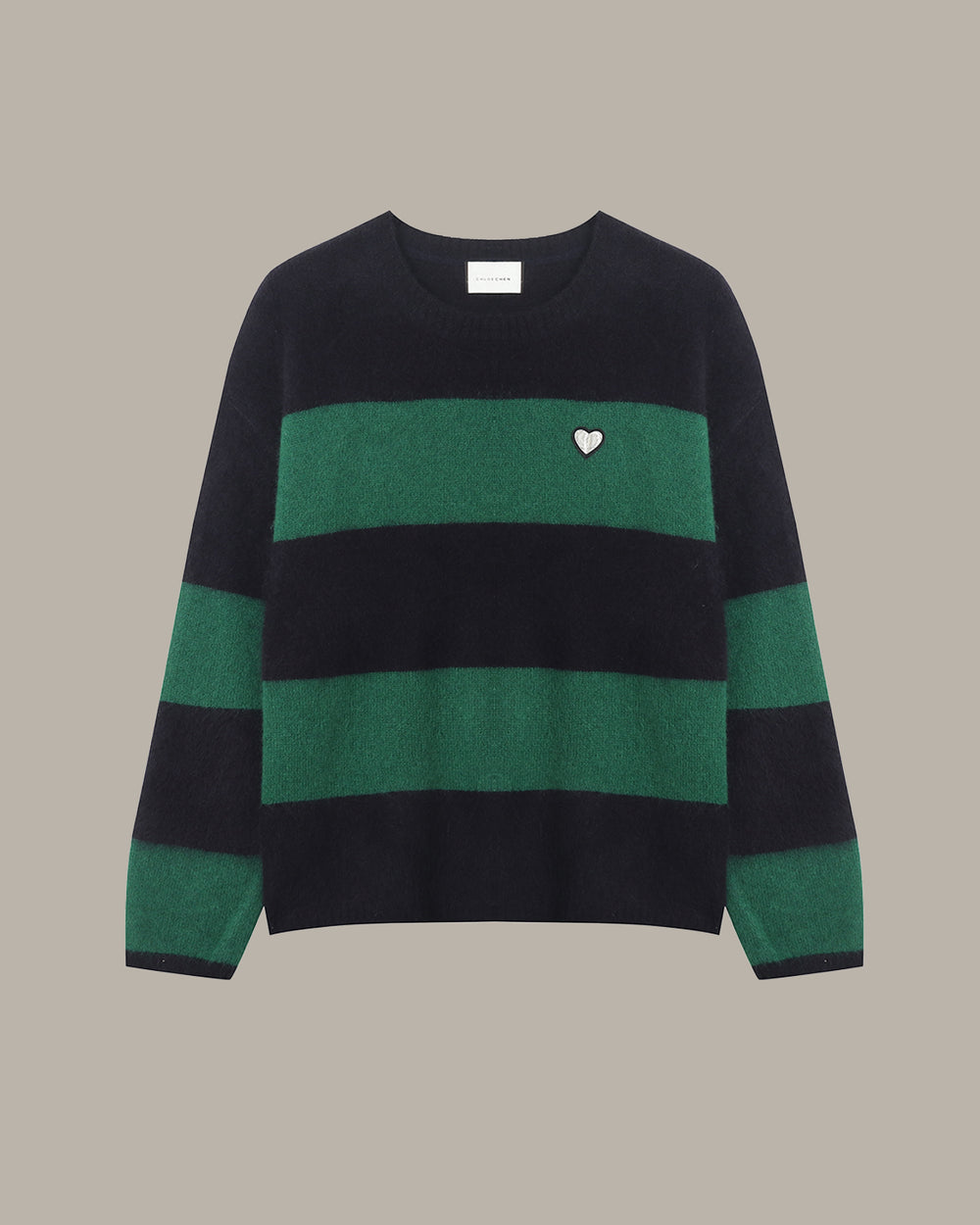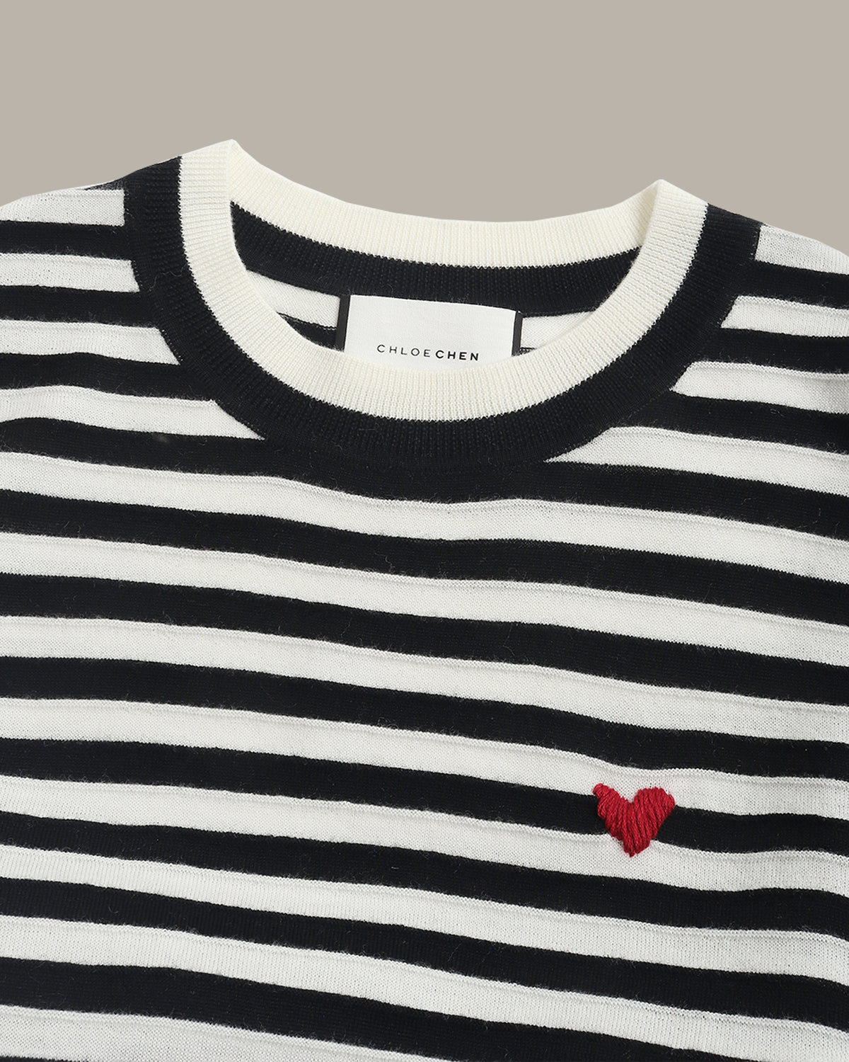 This wool long-sleeve tee features classic black-and-white stripes, softened by the fabric’s natural warmth and texture. A tiny red heart embroidery adds a subtle playful touch, while the relaxed fit and crew neck keep the silhouette casual and versatile. The wool material balances comfort with a substantial, durable feel, suitable for year-round layering.