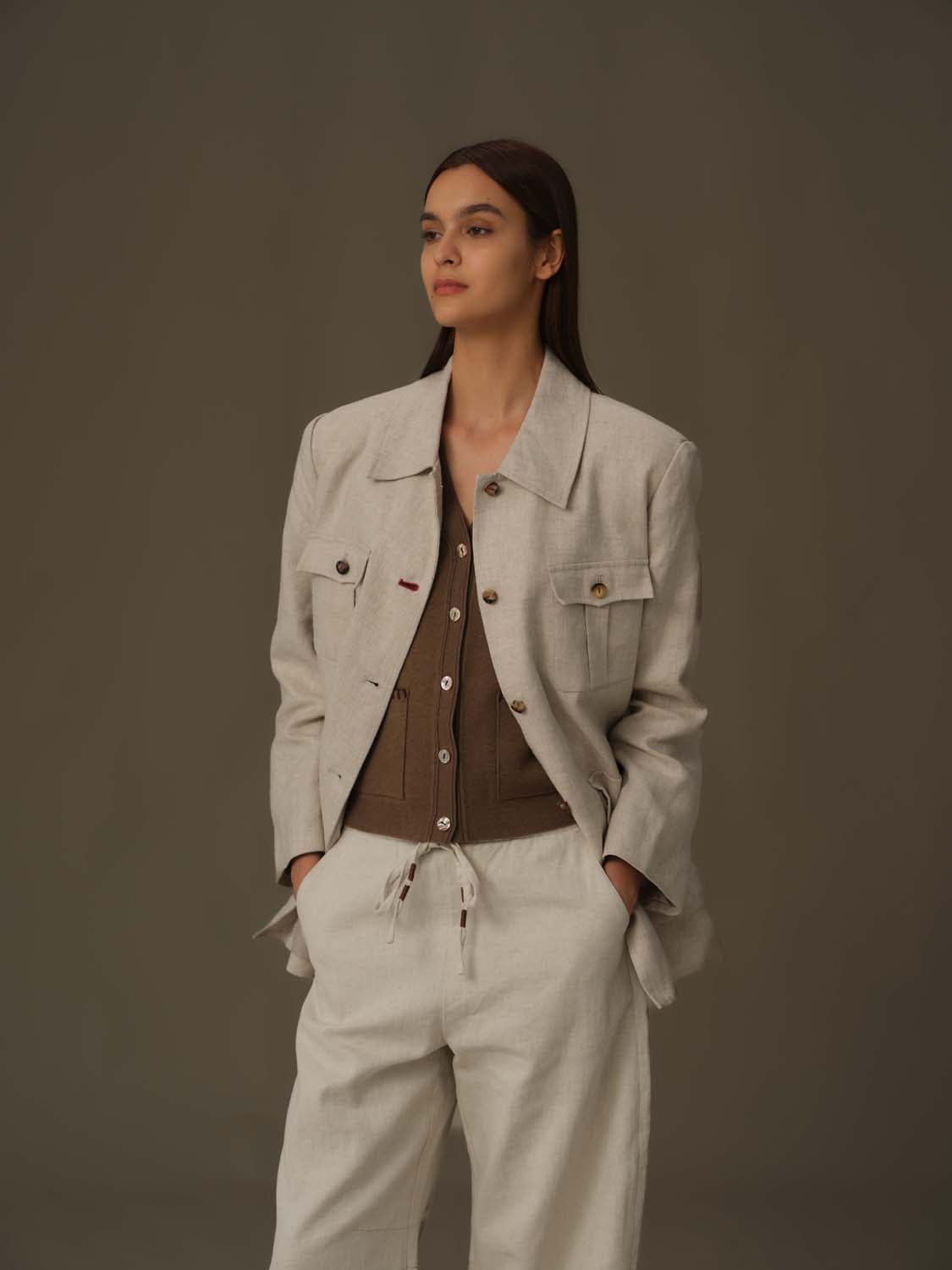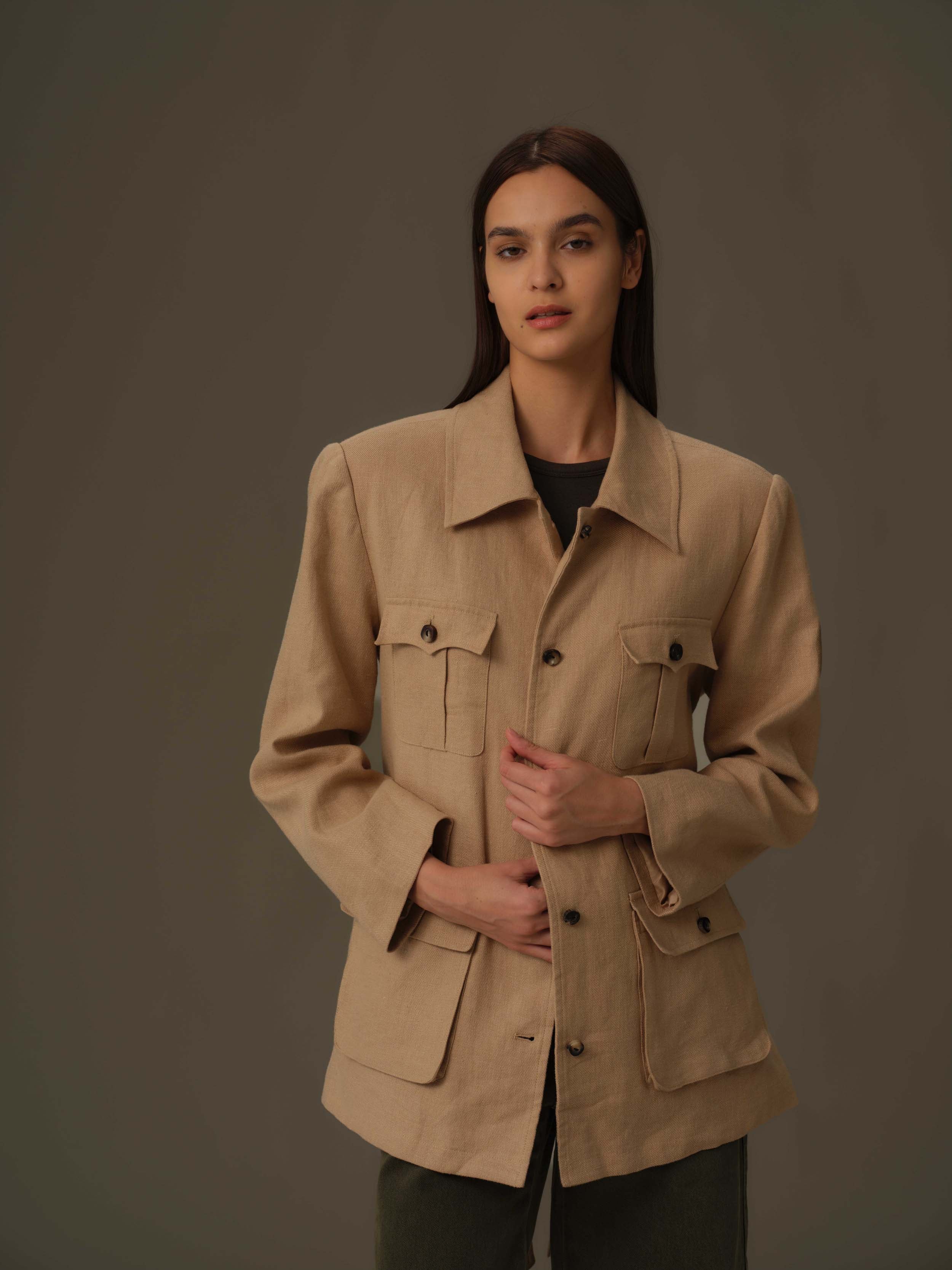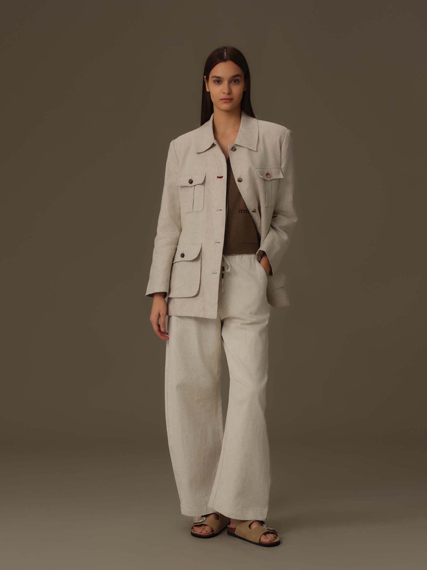 Crafted for both function and style, the 100% Linen Multi-Pocket Jacket offers a refined silhouette with practical utility. Its thoughtfully designed pockets provide convenient storage while maintaining a sleek, tailored look. Ideal for transitional weather, this jacket combines elegance with everyday versatility, making it a sophisticated addition to your wardrobe.