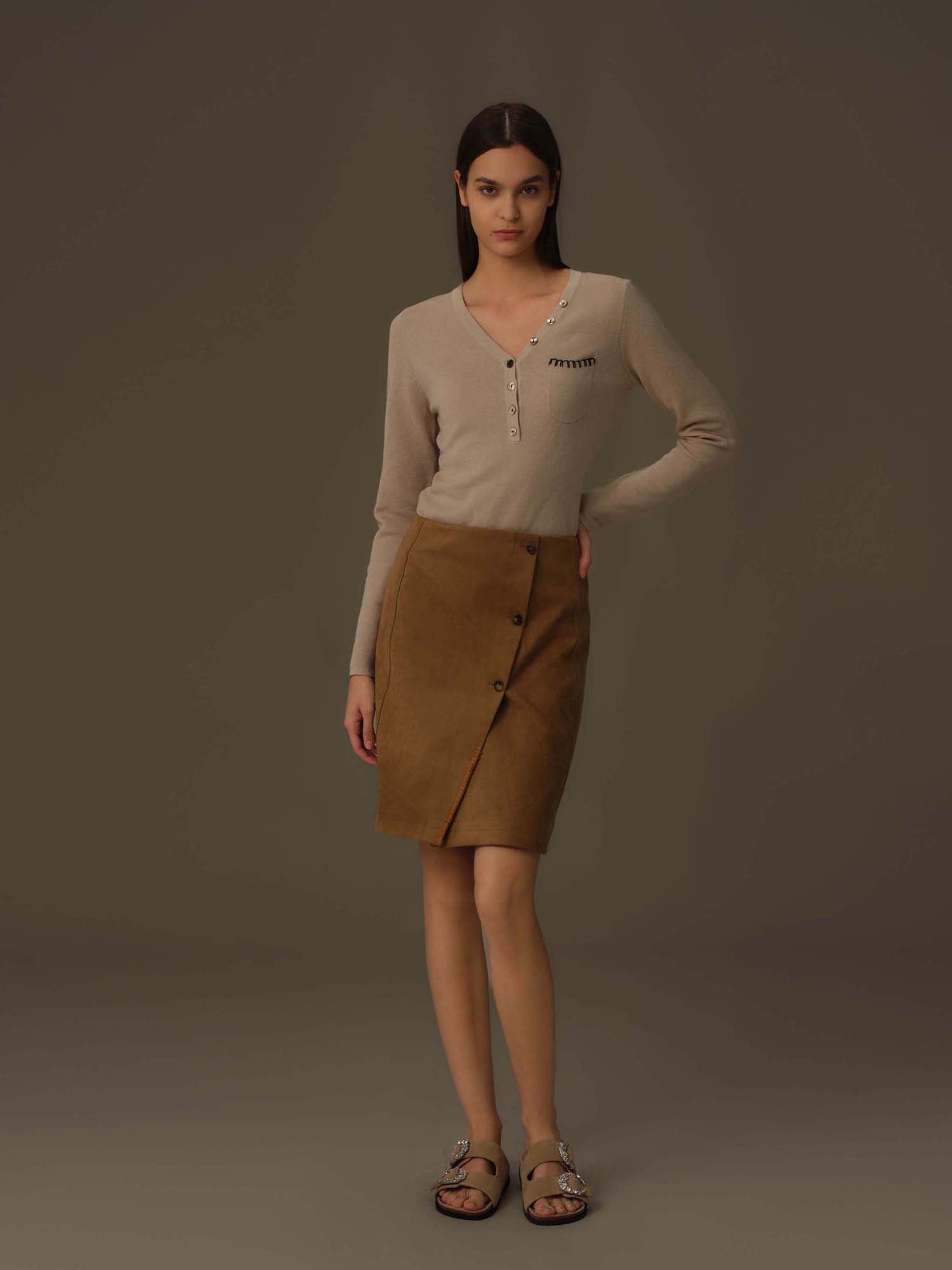 The Asymmetric Buttoned V-Neck Knit Top redefines modern elegance with its unique buttoned design and flattering V-neckline. Expertly crafted for a refined silhouette, this top offers a sophisticated twist on classic knitwear, perfect for elevating both professional and casual ensembles.