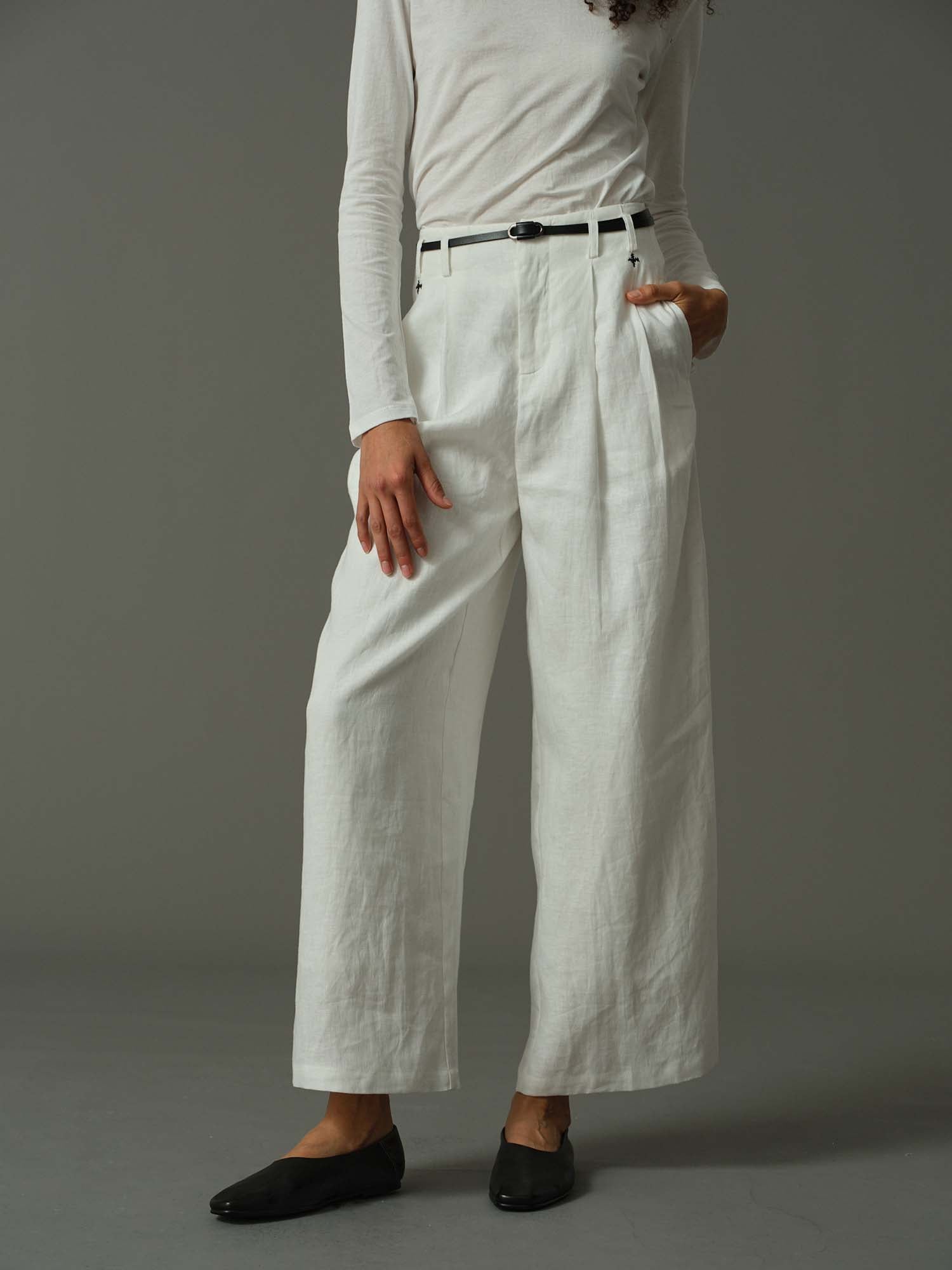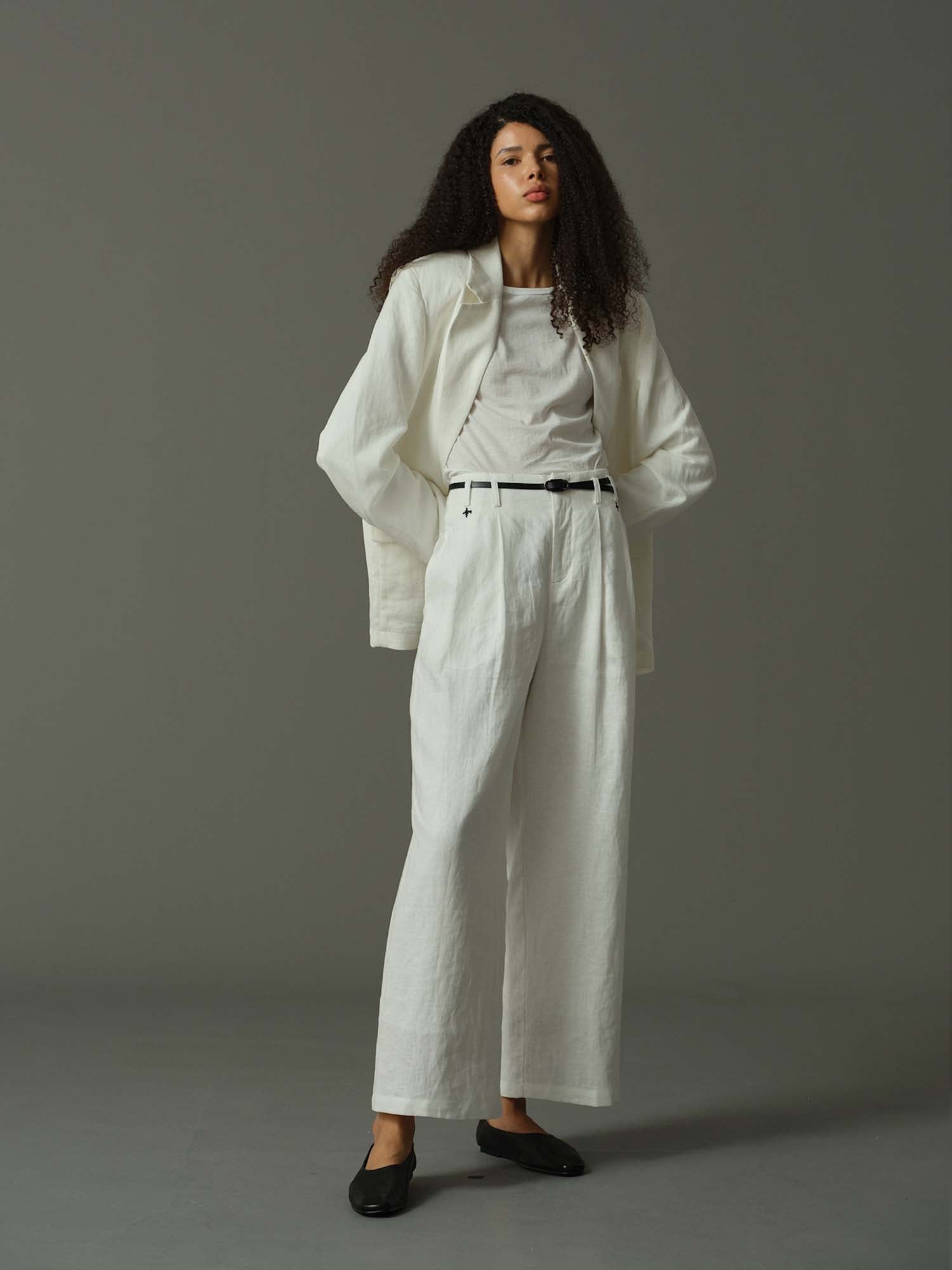 • Person wearing white wide-leg pants and a light-colored top on a gray background