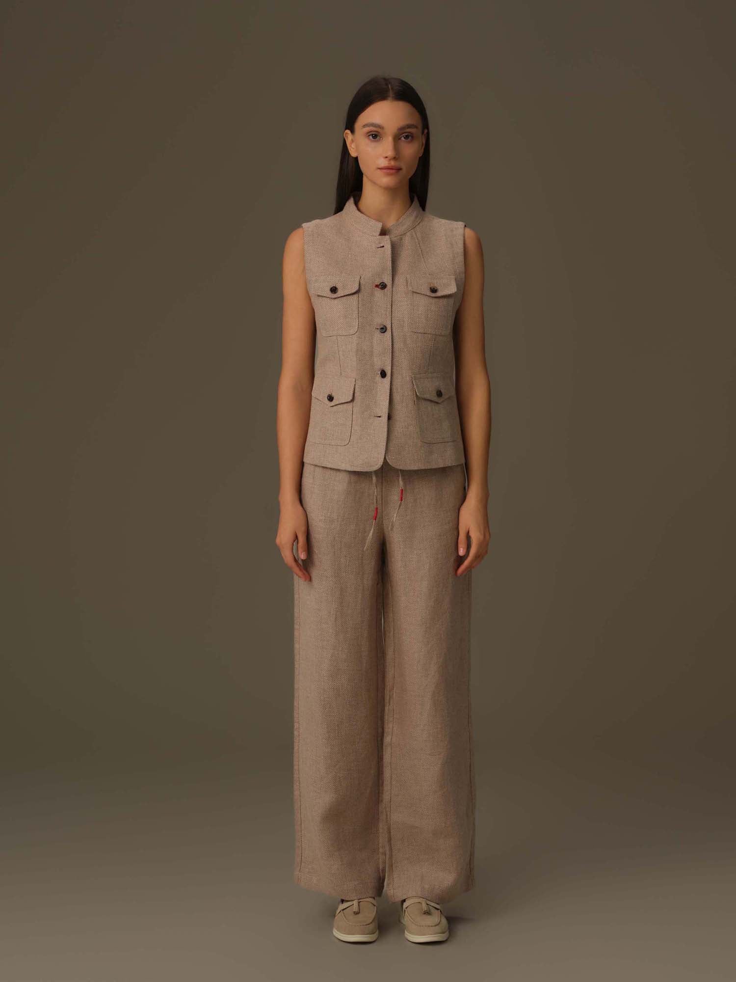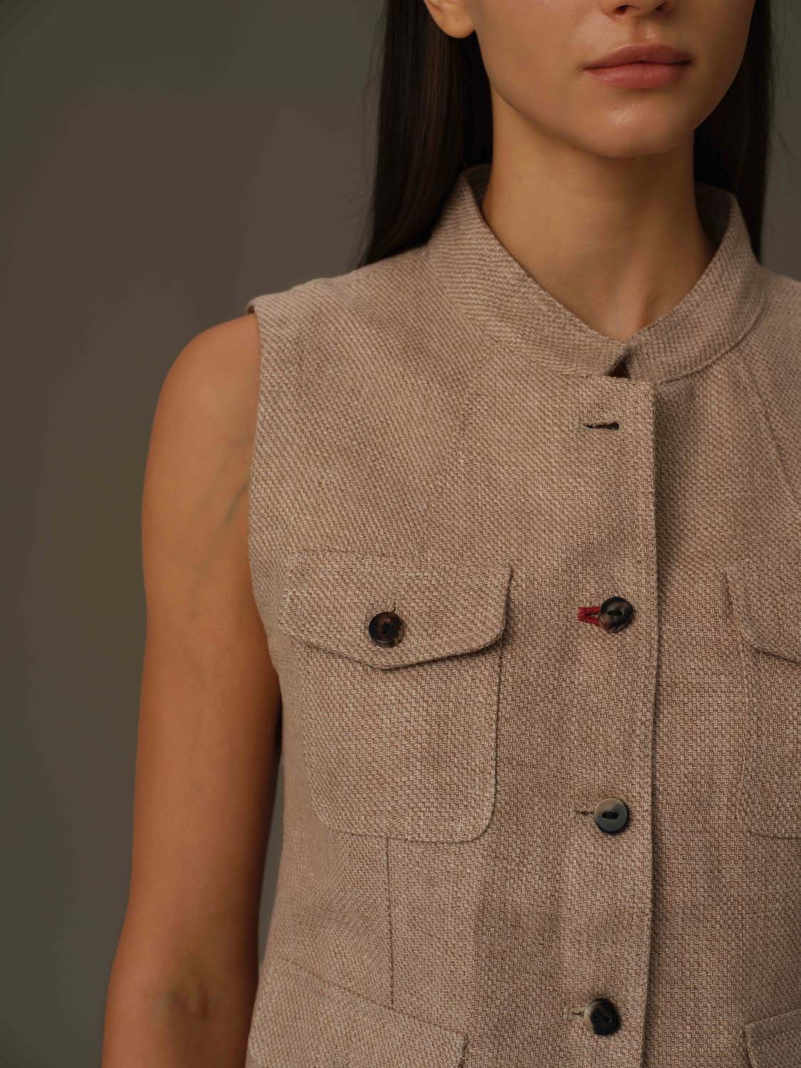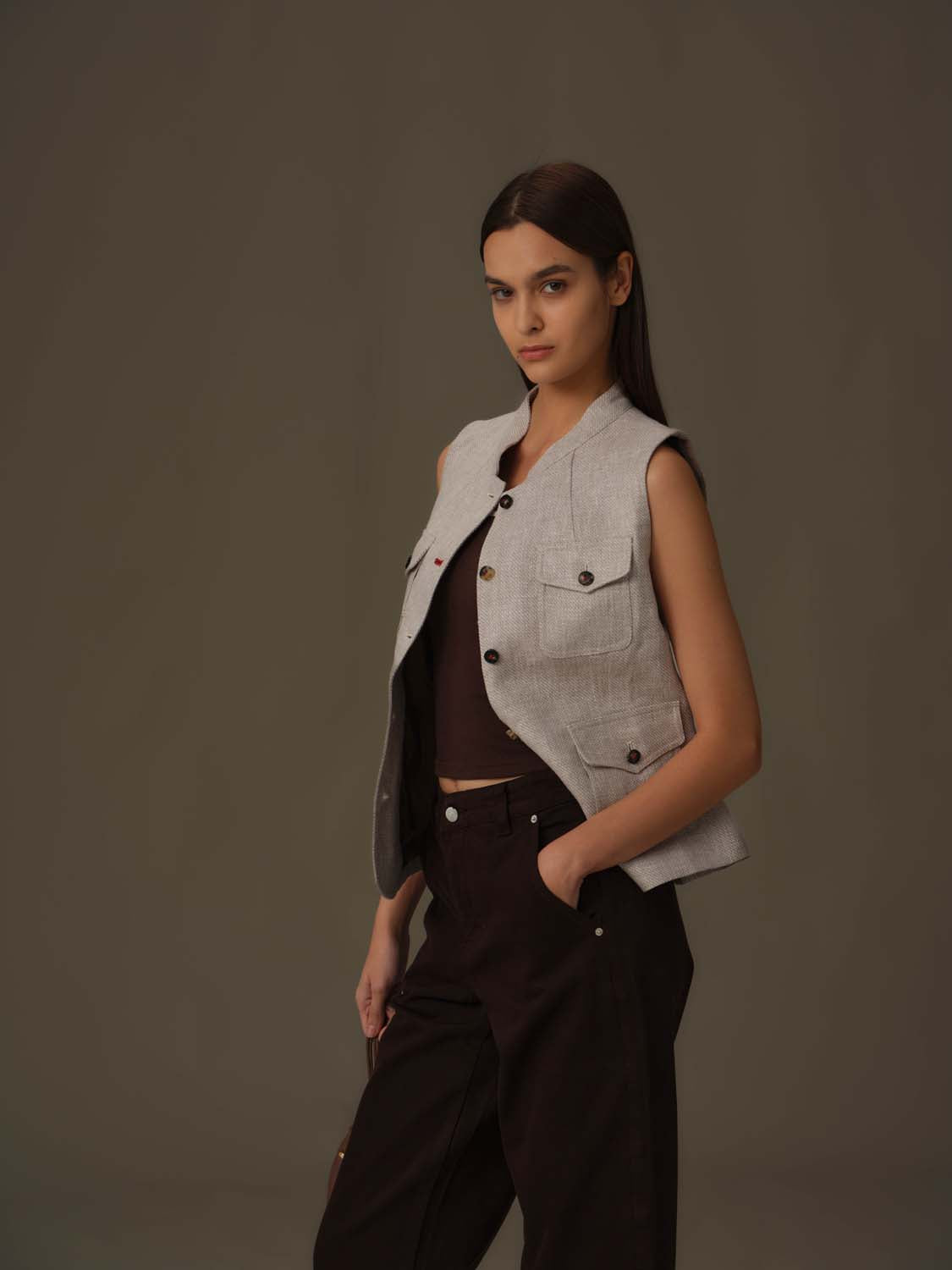 The Sleeveless Utility Linen Vest combines practical design with refined elegance. Crafted from breathable linen, it offers a lightweight, comfortable fit, while multiple pockets provide functional storage. This versatile vest adds a polished layer to any ensemble, perfect for sophisticated, effortless style.