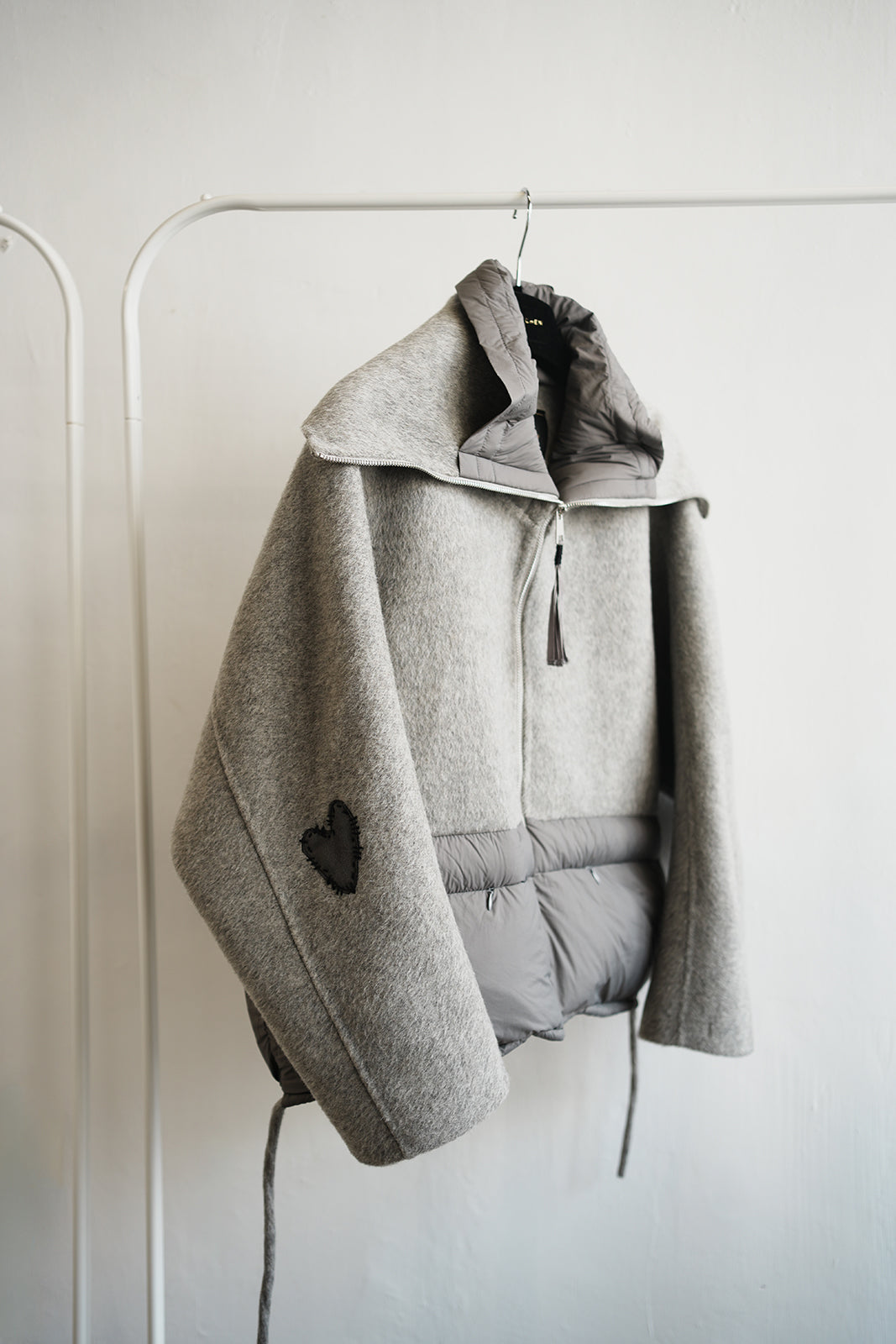 这件夹克采用羊驼毛与羊毛混纺面料,搭配填充拼接设计,质感与温暖兼具:上身柔绒面料适配下摆的绗缝结构,既有松软触感又显利落;填充领型增加层次细节,袖身的爱心装饰藏着巧思趣味,同色系拉链配流苏饰条,让整体风格精致又松弛。