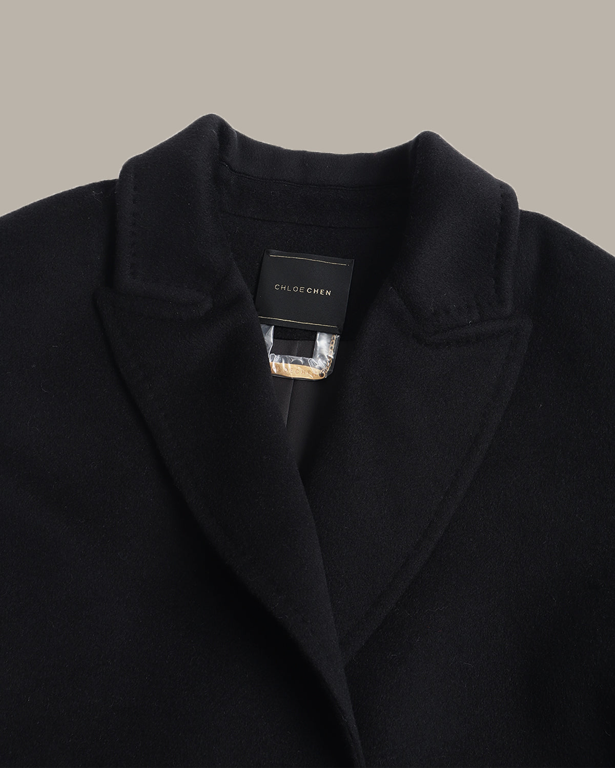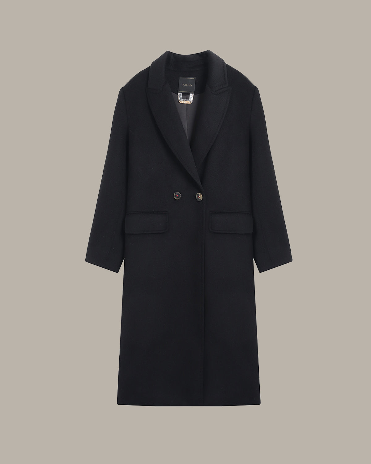 100% 纯羊绒面料触感柔软亲肤,兼具保暖性与垂顺感;H 型直筒版型剪裁利落、线条流畅,搭配经典西装领与双排扣设计,纽扣处的撞色细节为简约造型添了几分巧思。