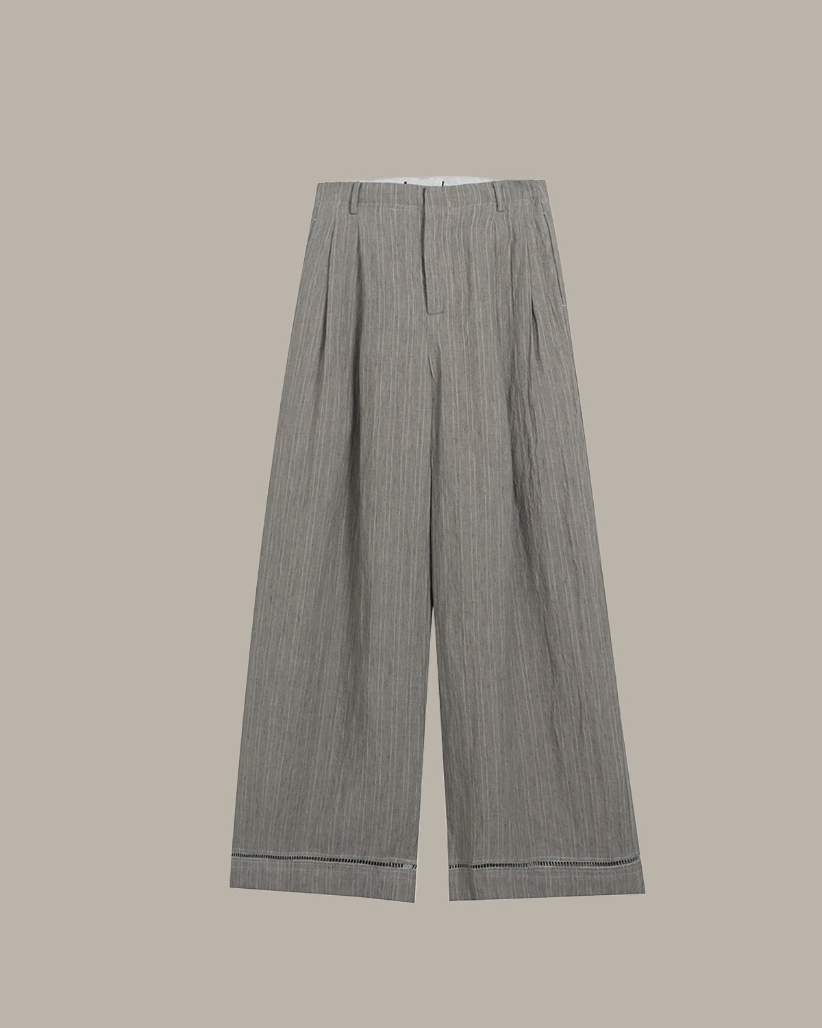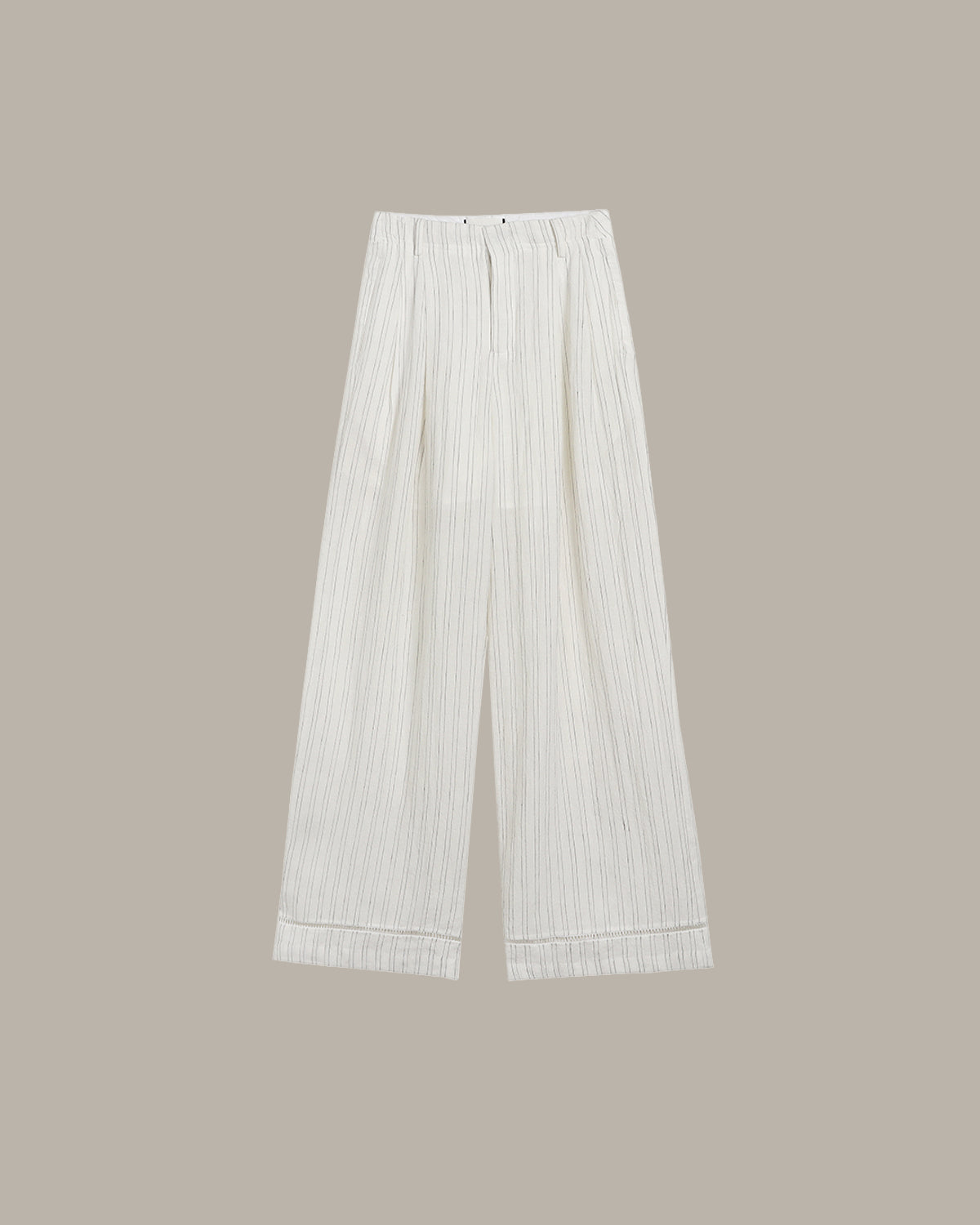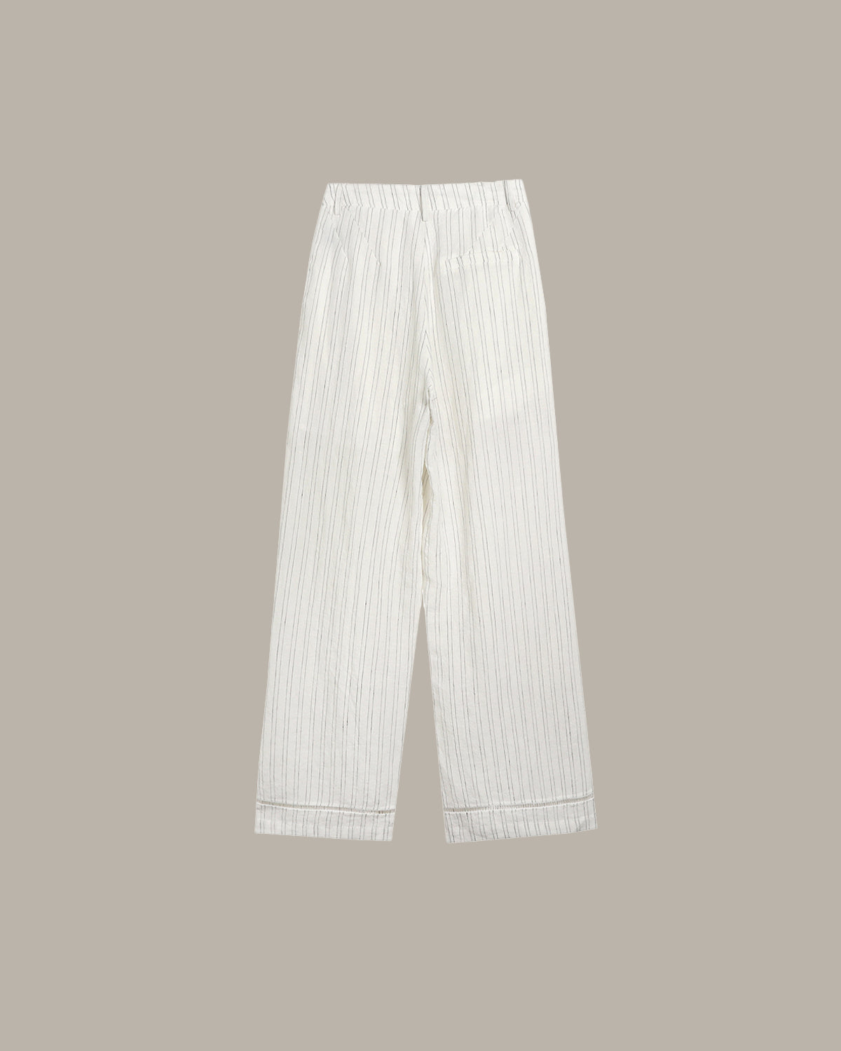 這款條紋亞麻長褲輕盈透氣,輕鬆展現優雅氣質。可搭配同款西裝外套和無袖上衣,打造精緻套裝;也可內搭坦克背心或外搭寬版鈕扣襯衫,展現隨性自在風格。