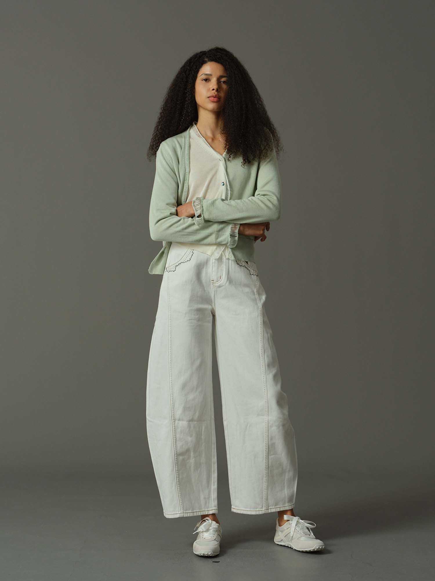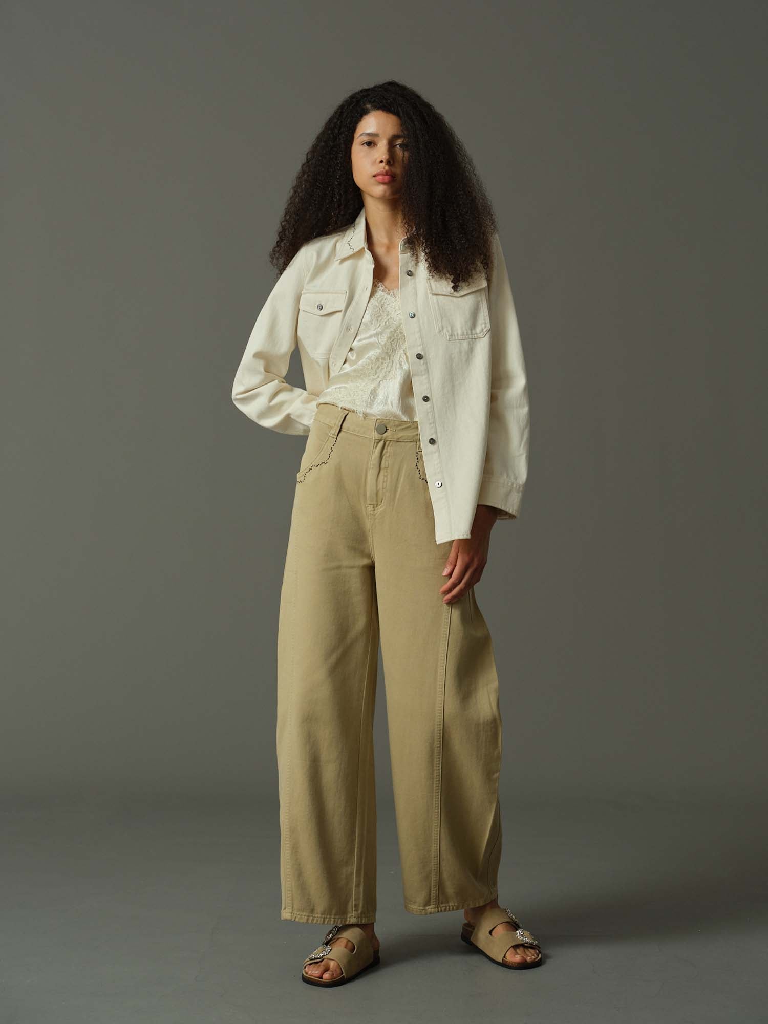 穿上這款彎刀型褲,輕鬆展現時尚風格,其特色是搶眼的撞色縫線和口袋細節。高腰設計和時尚的輪廓,讓這款褲子既時尚又舒適,非常適合悠閒卻不失精緻的造型。